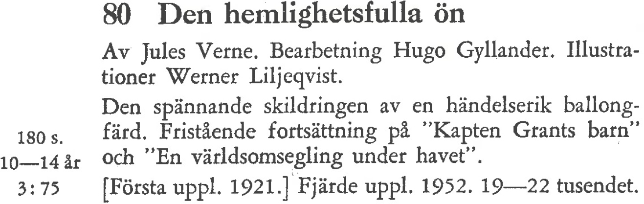 Bild 2. Sammanfattning och kategorisering av Jules Vernes Den hemlighetsfulla ön. Ur Sagas stora katalog. 1899–1956, Svensk läraretidnings förlag, 1957, s. 36.