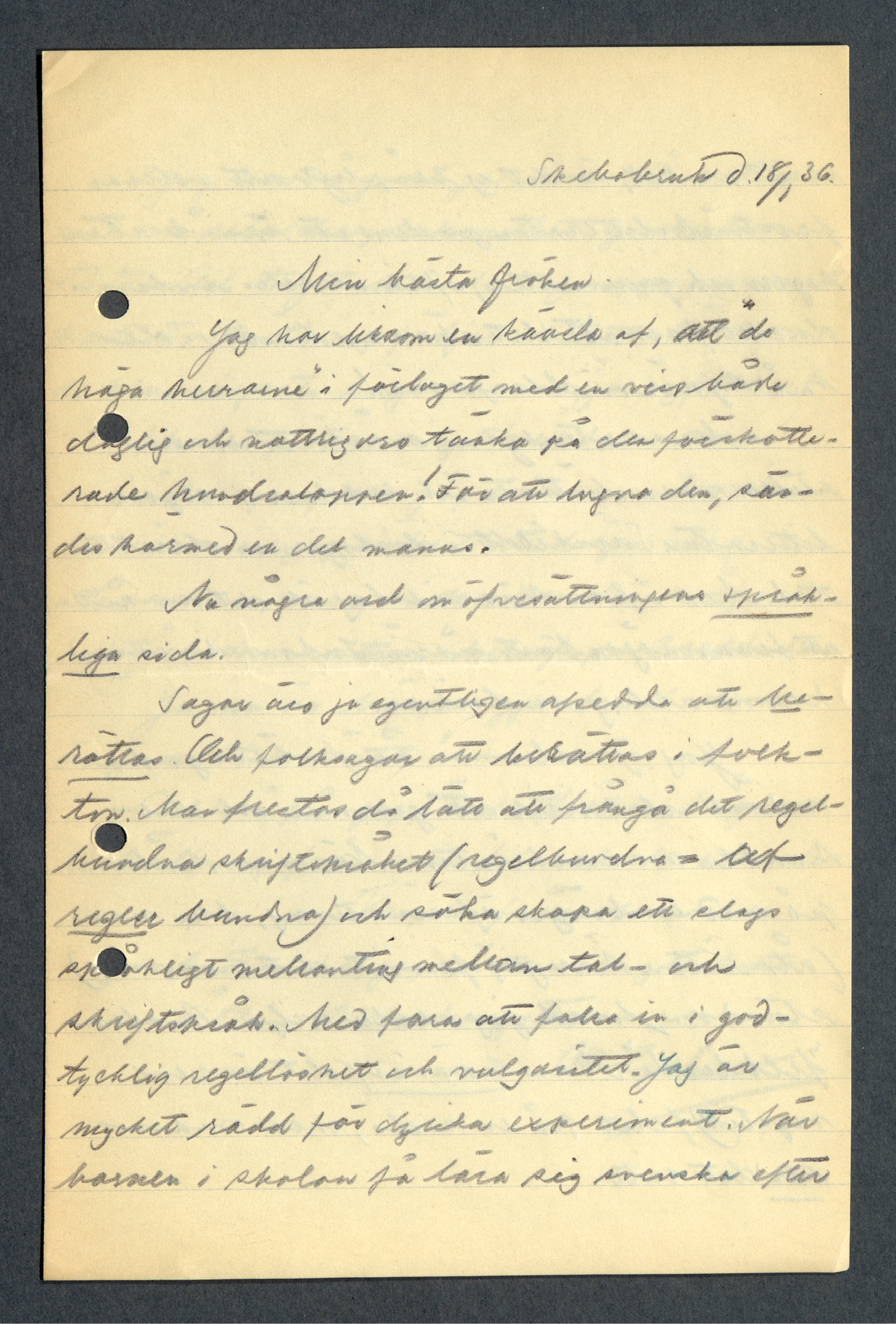 Sagor äro ju egentligen afsedda att berättas. Och folksagan att berättas i folkton. Man frestas då lätt att frångå det regelbundna skriftspråket (regelbundna = af regler bundna) och söka skapa ett slags språkligt mellanting mellan tal- och skriftspråk. Med fara att falla in i godtycklig regellöshet och vulgaritet. Jag är mycket rädd för dylika experiment. När barnen i skolan få lära sig svenska efter skriftspråket, är det ej lämpligt att i deras förströelselitteratur ge dem ett språk utan regler och grammatik, ofta alldeles individuellt formadt. Det skapar kaos i de små hjärnvindlingarna! Men naturligtvis måste tonen och stilen vara lättare och enklare i dylik litteratur. Särskildt i dialogernas direkta tal. Men äfven här vid lag är det svårt att finna någon fast norm. Inkonsekvenser kommer aldrig undvikas. Jag öfverlemnar åt frökens goda omdöme och kritik att genomse och behandla manu- skripten. När man håller på med en längre öfversättning, blir man (åtminstone har jag funnit det hos mig) eländans, hvad jag skulle vilja kalla ”felblind”. Man känner (det är ren mystik!) felet på en sida, men man ser det inte. Jag har så godt jag kunnat, ofta med små retuscher, behandlat grundtexten. Och tagit med de sagor, jag funnit bäst. Fortsättning följer snart. Äfven de klumpigaste sagor kunna ju hyffsas! Skulle fröken vilja meddela sina anmärkningar, vore jag tacksam. I vissa fall kommer jag säkert böja mig utan vidare, men i andra kunde någon kort ”diskussion” behöfvas. Brefledes. Ja, nu är början gjord, och den är ju alltid värst! (Gyllander till Wranér, 18 januari 1936, understrykning i original, bild 4)