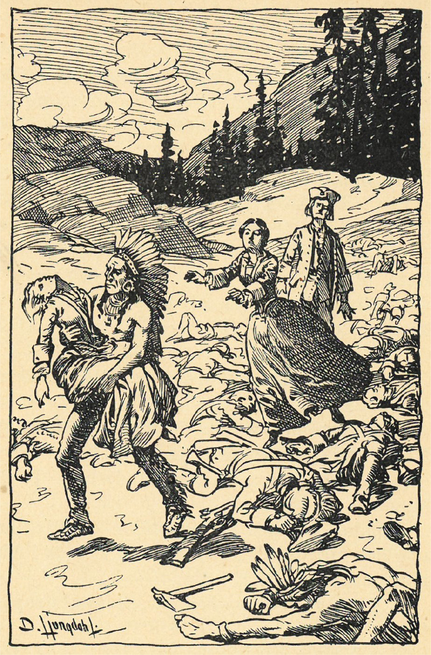 De kringspridda indianerna sprutto till vid det välbekanta ljudet, och i nästa sekund dånade ett tjut över slätten och genom skogen, ett tjut, som kom blodet att stelna i ådrorna på de borttågande. Mer än två tusen rasande vildar bröto fram ur skogen. Ett förfärligt slaktande följde. Det minsta motstånd tjänade endast till att öka mördarnas raseri. Överallt var död, och blodet flöt i strömmar. (Cooper, Den siste [1911] 153)