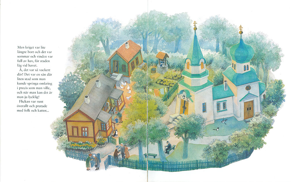Bild 1. Den mer än helsidesstora bilden fokuserar farmors hus och kyrkan och förmedlar just den öppenhet som flickan uppskattar så mycket i staden. Ur Ilon Wikland och Rose Lagercrantz, Den långa, långa resan (1995).