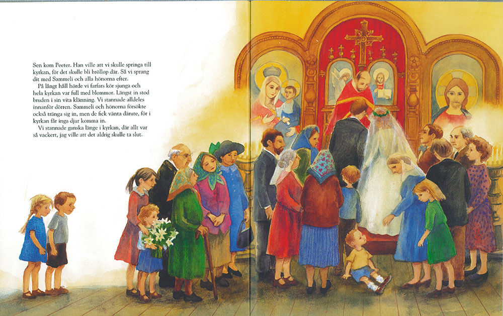 Den kyrkan är vackrast i världen. Den är vit med grönt tak och ett litet torn och därinne glimmar det av guld och levande ljus. Och när farfars kör sjunger, låter det som – ja, jag kan inte säga hur vackert det låter! Det finns inga bänkar därinne. Man får stå eller gå omkring som man vill. Och dörren är alltid öppen, så vi kan gå in precis när vi vill, Sammeli och jag. (4)
