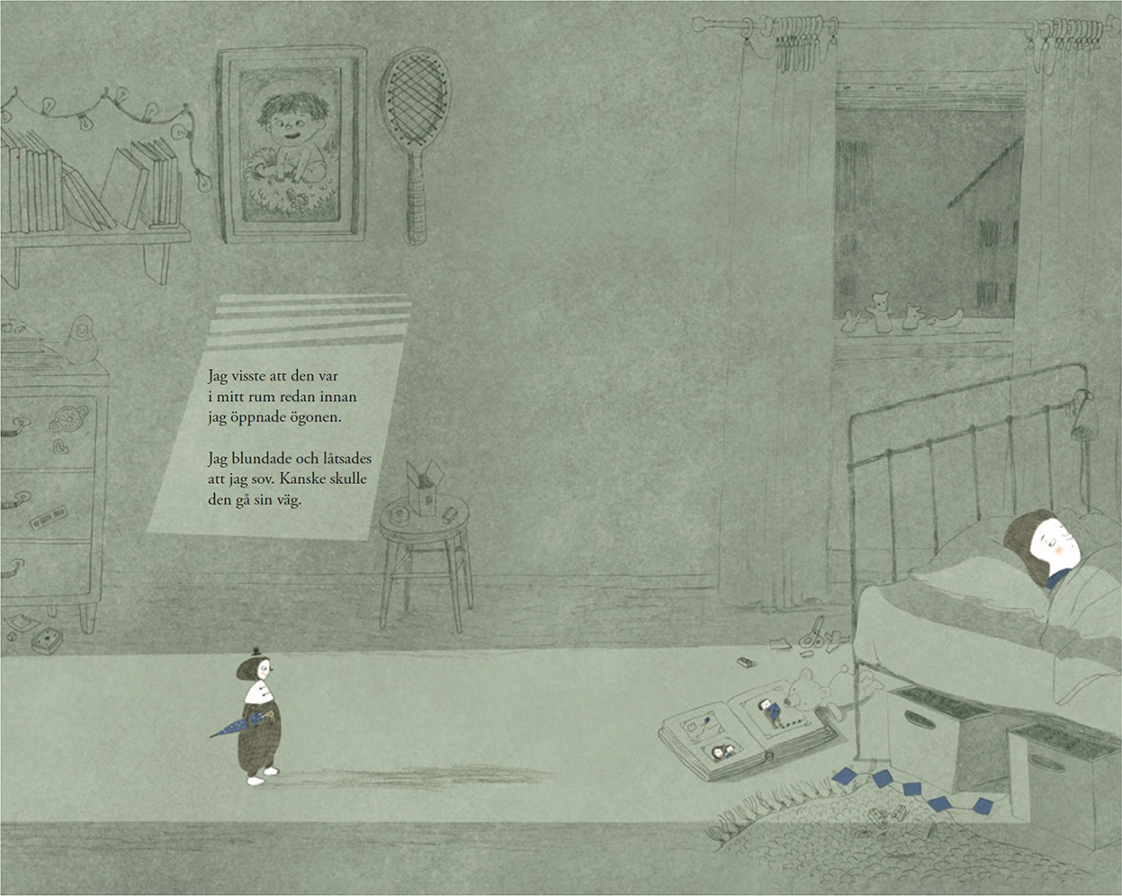 Mamman nämns bara en gång i texten, när barnet frågar skuggan om den sett mamman. Däremot syns mamman på bild flera gånger och är i bilderna starkt sammankopplad med draken på försättsbladet. Det föranleder, om inte friktion, i alla fall en öppenhet och viss obestämbarhet. På det första uppslaget (se bild 1) kan vi till exempel se ett fotoalbum med bilder på mamman och barnet, på draken och på barnet med draken i famnen. Dessa detaljer framträder då de, till skillnad från den i övrigt grågröna sidan, är färglagda i blått. Den blå draken skymtar även under barnets säng och skuggans paraply har samma klara blå färg och samma mönster som draken som flygs på försättsbladet. Här förekommer alltså en tydlig koppling även mellan skuggan och mamman, men hur denna koppling ska tolkas är öppet.