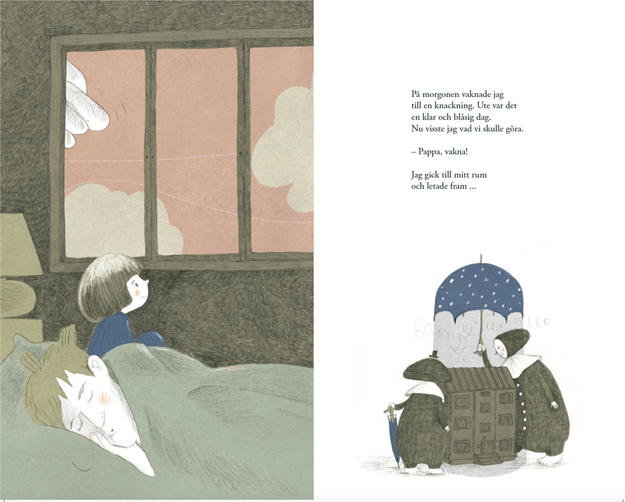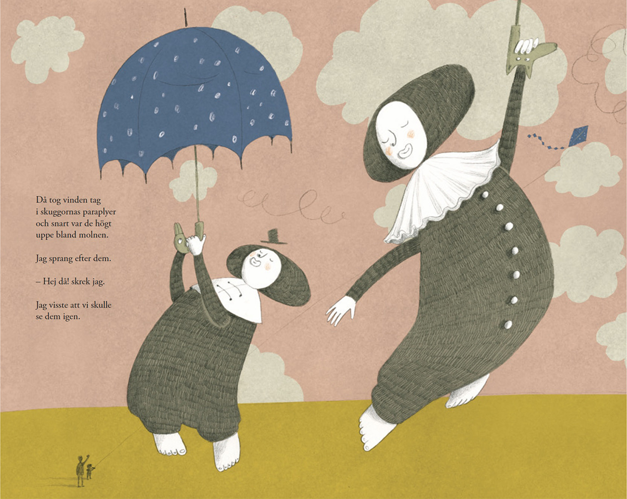 “Jag visste att den var i mitt rum redan innan jag öppnade ögonen” (Hurme och Hurme).1 Så inleds Skuggorna. I sängen ligger ett barn och hoppas innerligt att skuggan, som dykt upp i hens sovrum, ska vara borta nästa morgon (se bild 1). Det är den inte, i stället har den klättrat upp i sängen. Successivt tar den oinbjudna, clownlika skuggan över mer och mer av barnets liv. Skuggan sitter på morgongröten så att barnet inte kan äta frukost, den låter inte barnet leka med de andra på dagis, och den låser in sig på toaletten så att barnet kissar på sig. Samtidigt växer den sig allt större och en morgon, när barnet sovit i pappans säng, har också pappan en skugga som (för)följer honom. Skuggorna öppnar sina stora paraplyn och kastar mjuka mörker över både barnet och pappan, som plötsligt är försenad, går vilse och tappar bort sin väska. Läsaren förstår att något har hänt med mamman i familjen, men vad det är sägs inte. På försättsbladet syns tre figurer som flyger en blå drake, men på eftersättsbladet finns bara två figurer kvar: pappan och barnet.