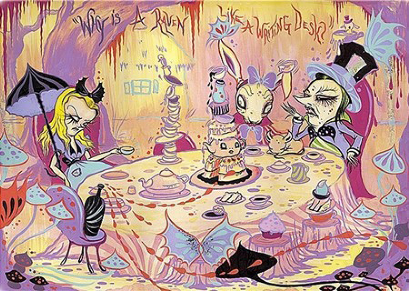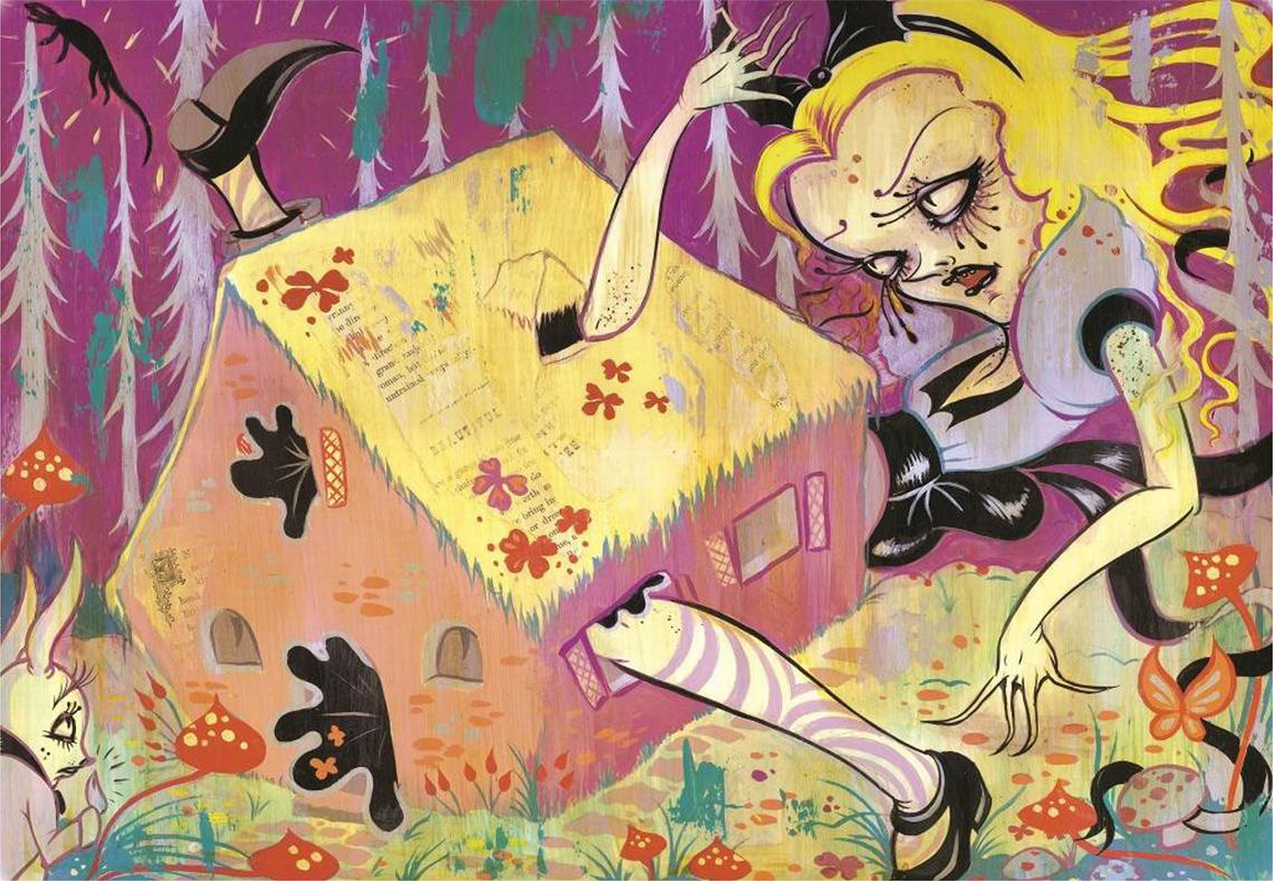 Mark Burstein notes that Camille Rose Garcia’s “colourful but creepy, cartoony, lowbrow LA Goth-punk decorations exist in not a Wonder- but a Waste-land. Alice herself is a nightmare: emotionally unstable, with a distorted and metamorphic body and wildly melting mascara” (99–100). Meanwhile, Jack Zipes describes Garcia as a: