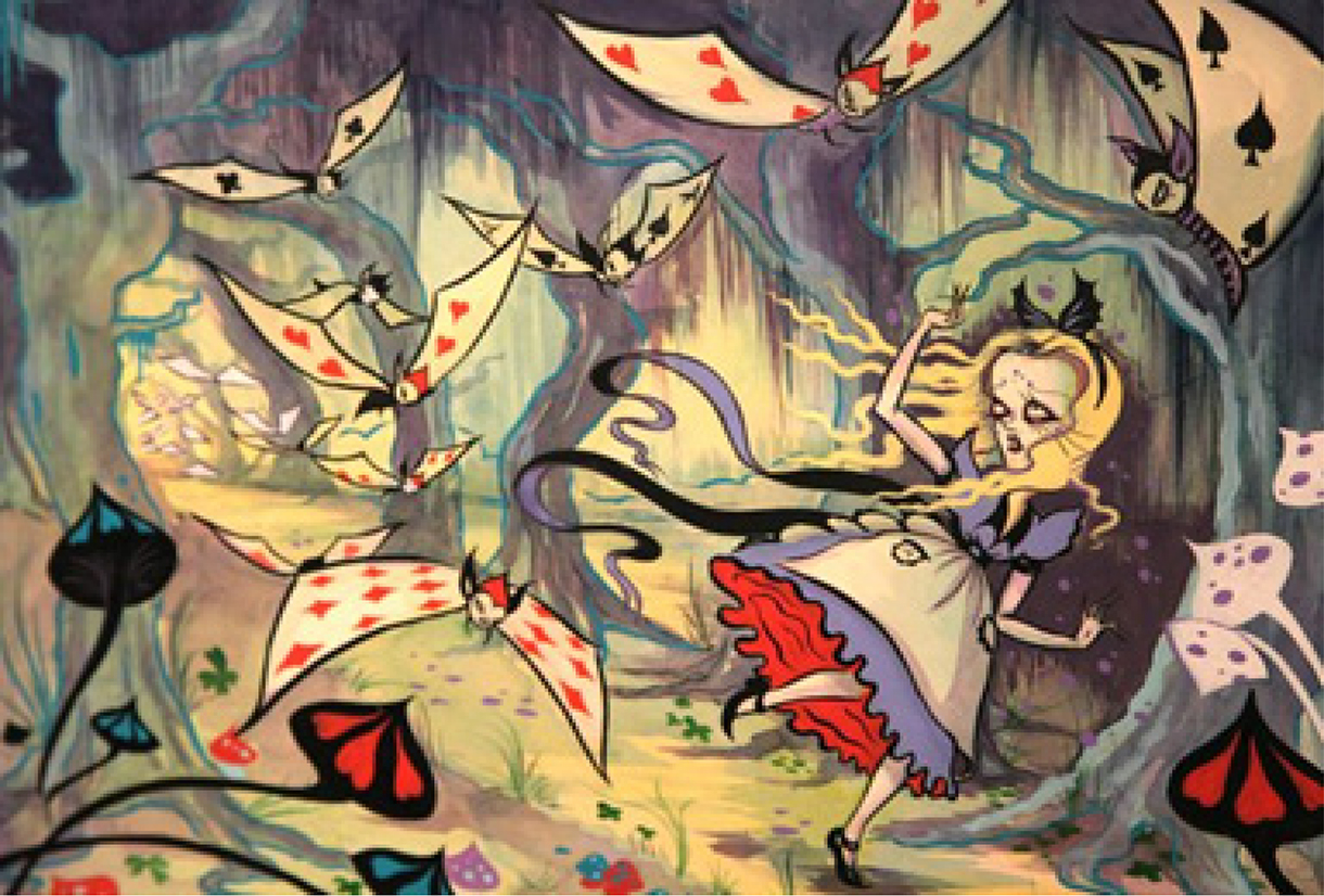 Plagued in Wonderland by questions of self-uncertainty, Alice endures a journey of nonsensical adventures only to wake up and discover it was all a dream. However, the Caterpillar’s enigmatic question – “who are you?” – prevails, and this article asks the same question of Camille Rose Garcia’s illustrated Alice – who is she?1 Zoe Jaques and Eugene Giddens argue that “some of the more radical artistic interpretations […] are indicative of an interest in moving the text beyond the reach of the child reader, via a process of rendering Wonderland dark and grotesque [and] obliquely sexual” (184). In many ways, Garcia’s illustrations of Alice capture those radical qualities outlined by Jaques and Giddens and transitions the character of Alice from the serene banks of Oxford into a much darker and more sinister version of Wonderland. This article explores the character of Alice in Garcia’s Wonderland, whilst also referring to the Disneyfication of Alice’s appearance. The Disney metapicture is an important lens here as the uncanny resemblance to the 1951 Alice looms in Garcia’s depiction of Carroll’s protagonist. Thus, I investigate the impact of Walt Disney’s 1951 animated film on Garcia’s depiction of Alice and perform a close reading of a selection of illustrations from her 2010 published edition of Alice’s Adventures in Wonderland through a Disney lens. I will also consider Garcia’s Alice as a contemporary representation of the “Gothic child.”