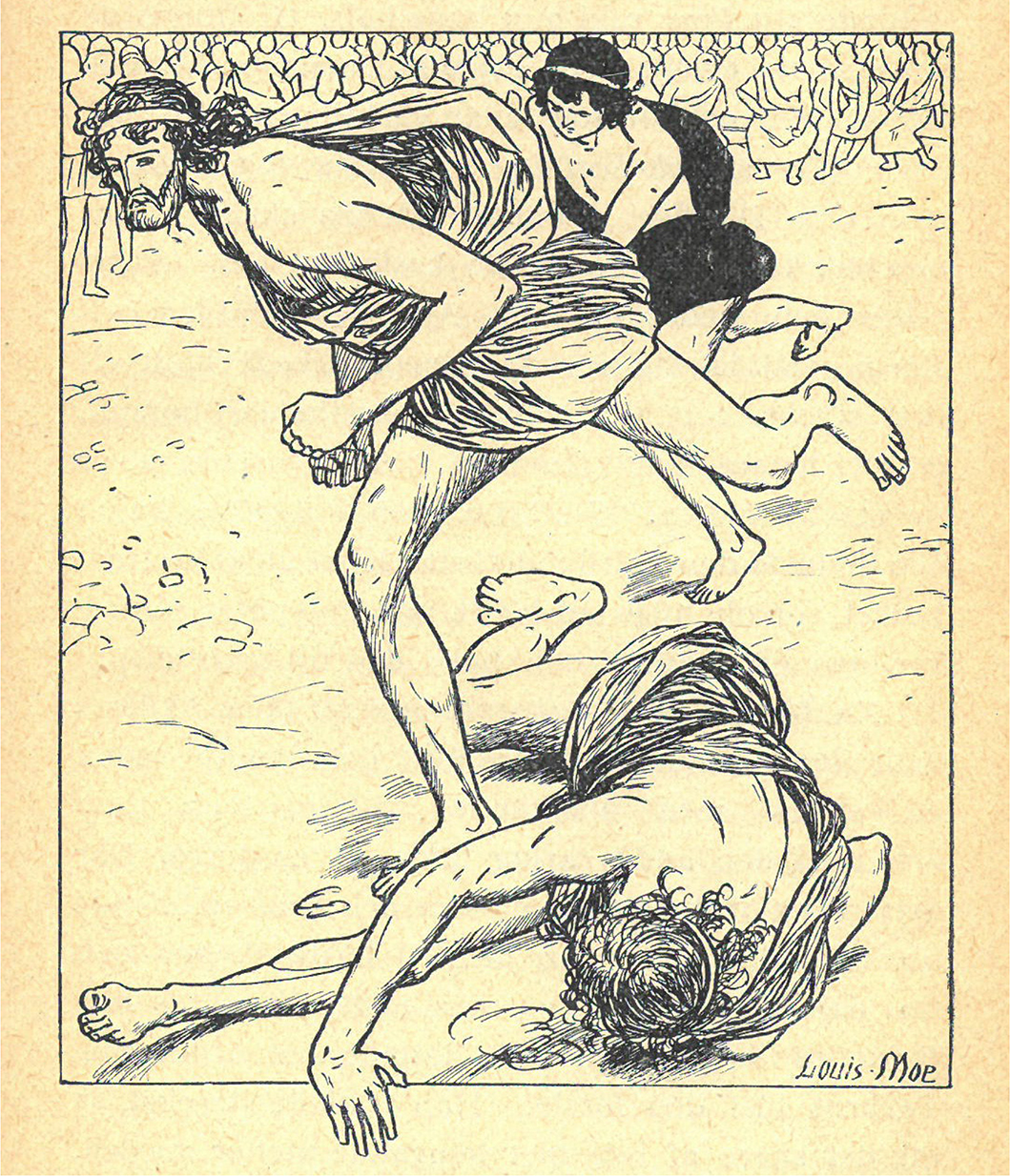 Illustrationerna i Bergs Trojanska kriget utgör till skillnad från i Dalströms verk en estetisk enhet. Samtliga är svartvita med tydlig kontrast mellan svarta och vita fält, vilket är kännetecknande för Barnbiblioteket Sagas layout och typografi. I likhet med övriga verk i bokserien har boken fler illustrationer än genomsnittet i sekelskiftets barnboksutgivning (Bergstrand 29–30). Bilderna är nyproducerade och till arbetet anlitades i samtiden uppburna illustratörer, såsom Louis Moe. Han var vid sekelskiftet 1900 en etablerad konstnär och illustratör, med ett intresse för såväl barn- och ungdomslitteratur som mytologi, sagor och historia (Lund 33, 77). Bergstrand visar i sin analys av Moes illustrationer till Trojanska kriget att relationen mellan text och bild är tät samt att bildberättandet är livfullt och dramatiskt, ”fjärran från nyklassicismens kyliga distans till motiven” (166). Karaktärerna är i förgrunden och de fångas ofta mitt i en rörelse. När Diomedes vagn far genom slagfältet avbildas hjälten och hans körsven snett bakifrån omgivna av fallande kroppar, medan den fallna löparen i tävlingarna till Patroklos ära till och med spränger ramen med handen (bild 3). Som Bergstrand noterar använder Moe olika kompositioner och stilmedel (166), men i jämförelse med Dalströms Grekiska guda- och hjältesagor skapas i Bergs bok ett större intryck av enhetlighet genom att illustrationerna utförts av i huvudsak samma person, i samma teknik och i samma tid.