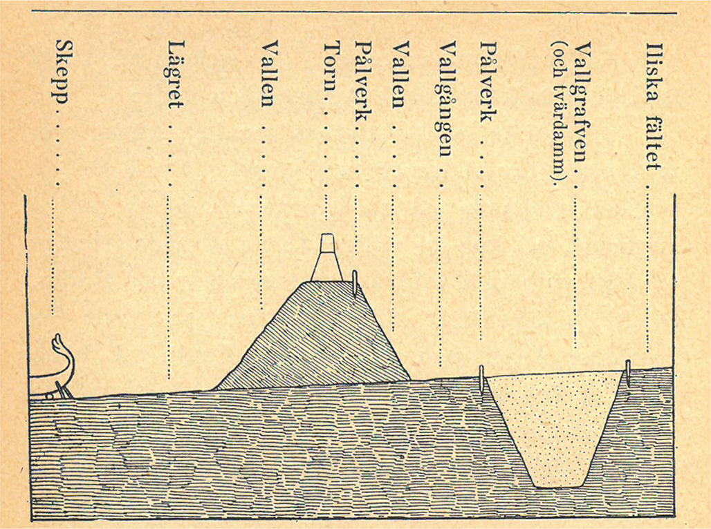 Strävan efter historisk förankring och faktaförmedling kommer också till uttryck i illustrationerna. Moe har vinnlagt sig om att återge detaljer i kläder, föremål och vapen utifrån hur de gestaltas i antika vasmålningar, samtidigt som gudarna avbildas med sina traditionella attribut (Bergstrand 167). En likhet med facklitteratur etableras vidare genom användningen av kartor och genomskärningsbilder. Trojanska kriget innehåller tre kartor, möjligen av Bergs hand då han själv givit ut läroböcker i geografi och hade ett stort intresse för kartritning (Bergstrand 150; Landahl 193–198). Mykene, Arkadien, Troja och andra i verket namngivna platser placeras därmed i ett geografiskt och historiskt rum. Därtill finns en ritning av skeppslägrets vallgrav och förskansningar i genomskärning, som speglar den detaljerade beskrivningen av byggnadsverket i texten (bild 4). Kartorna och ritningen spelar en mindre roll för att tydliggöra eller illustrera det narrativa skeendet utan ger snarare konkretion åt ett historiskt innehåll.