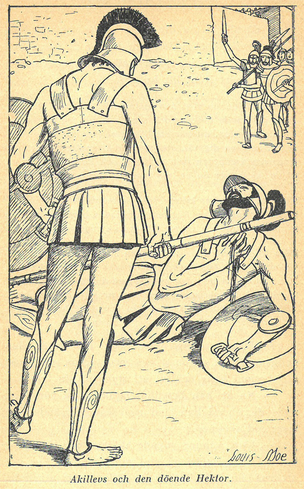 Bild 5. Akilles och den döende Hektor. Ur Fridtjuv Bergs Trojanska kriget, s. 253.