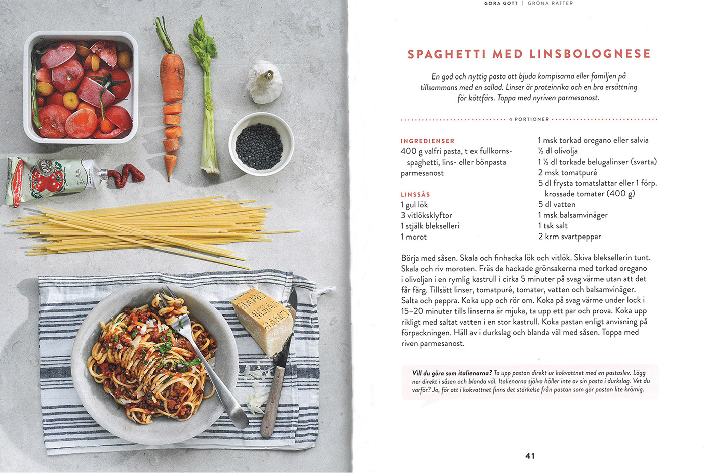 Kokboken Göra gott har en tydelig miljøagenda, og baksideteksten fremhever at den er ”för Greta Thunbergs generation. Den inspirerar barn och ungdomar till att förändra världen – i sitt eget kök” (Landqvist og Voss). Boken bærer preg av å ville formidle betydningen av en helhetlig og bærekraftig tilnærming til matproduksjon og -forbruk. Visuelt kommuniseres dette ved å blande tydelig infografikk med uglansete og litt rustikke matfoto til de ulike oppskriftene. Inspirasjonen til å forandre verden ser ut til å skulle skje gjennom informasjon. I liten grad legges det opp til spørsmål og refleksjon rundt kunnskapen som formidles. Dette henger kanskje sammen med kokeboksjangerens monologiske imperativ: ”Börja med såsen. Skala och finhacka lök och vitlök” (Landqvist og Voss 41, se bilde 1). Teksten byr riktignok noen steder på et retorisk spørsmål, men gir aldri leseren pusterom til å få tenkt seg om. Spørsmålene fungere bare som passasjer fra informasjon til informasjon. I forbindelse med redegjørelsen for sammenhengen mellom befolkningsvekst og behovet for å produsere mer mat for at alle skal spise seg mette, spørres det: ”Men hur ska vi klara det när planeten redan mår så dåligt av alla påfrestningar vi utsätter den för? Jo, en avgörande lösning är att få stopp på matsvinnet!” (145). Her ser vi hvordan leseren blir servert et ferdig formulert svar uten at det blir lagt opp til en presentasjon av mulige løsninger der leseren kan aktivere sine forkunnskaper og relatere spørsmålet til egen sosial, geografisk og kulturell posisjon.