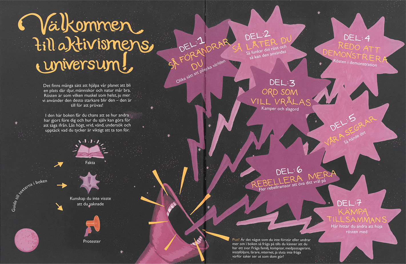 En helt annen og aktivistisk du-henvendelse finner vi i Rebellens nybörjarbok, der det innledningsvis heter at ”[i] den här boken får du chans att se hur andra har gjort före dig och hur du själv kan göra för att säga ifrån” (Bornedal, min kursiv, se bilde 2).7 Det at leseren gis en sjanse, impliserer også at det er opp til leseren å ta stilling til om man vil prøve ut forslagene, eller ikke. For å bli klar over hva man mener og vil, oppfordres også leseren til å ”fråga på tills du känner att du har ett svar”. Med sine nesten kaotisk distribuerte piler, stråler og tekstbobler understreker bokens illustrasjoner og visuelle design at ulike perspektiv fører til ulike standpunkt og handlinger. Leseren må derfor selv finne måter å orientere seg i kunnskapen som formidles, og velge sin(e) løype(r) fra fakta via argumentasjon til aktiv handling.