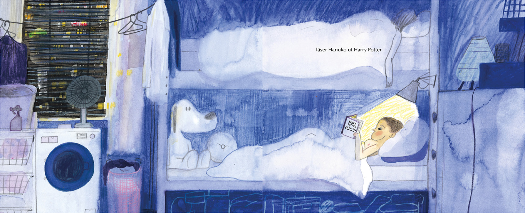 Det tionde uppslaget, med texten ”läser Hanuko ut Harry Potter”, visar en koncentrerad pojke som ligger i en våningssäng och läser (bild 1). Kontrastverkan är visuell – lampan vid sängen lyser upp mörkret runt Hanuko. Spänning skapas genom att pojken, som skulle kunna sova (likt människan i översängen), är vaken. Utsikten genom fönstret i rummet förstärker spänningen mellan vila och vakenhet genom att visa en stad som inte sover, med neonljus, utanför Hanukos sovrum. Eftersom Hanuko själv väljer att inte sova, trots att det är natt och rumskamraten sover, visar uppslaget både hur något är (as is) – Hanuko läser – och väcker tankar om hur något skulle kunna vara (as if) – sömn även för Hanuko.