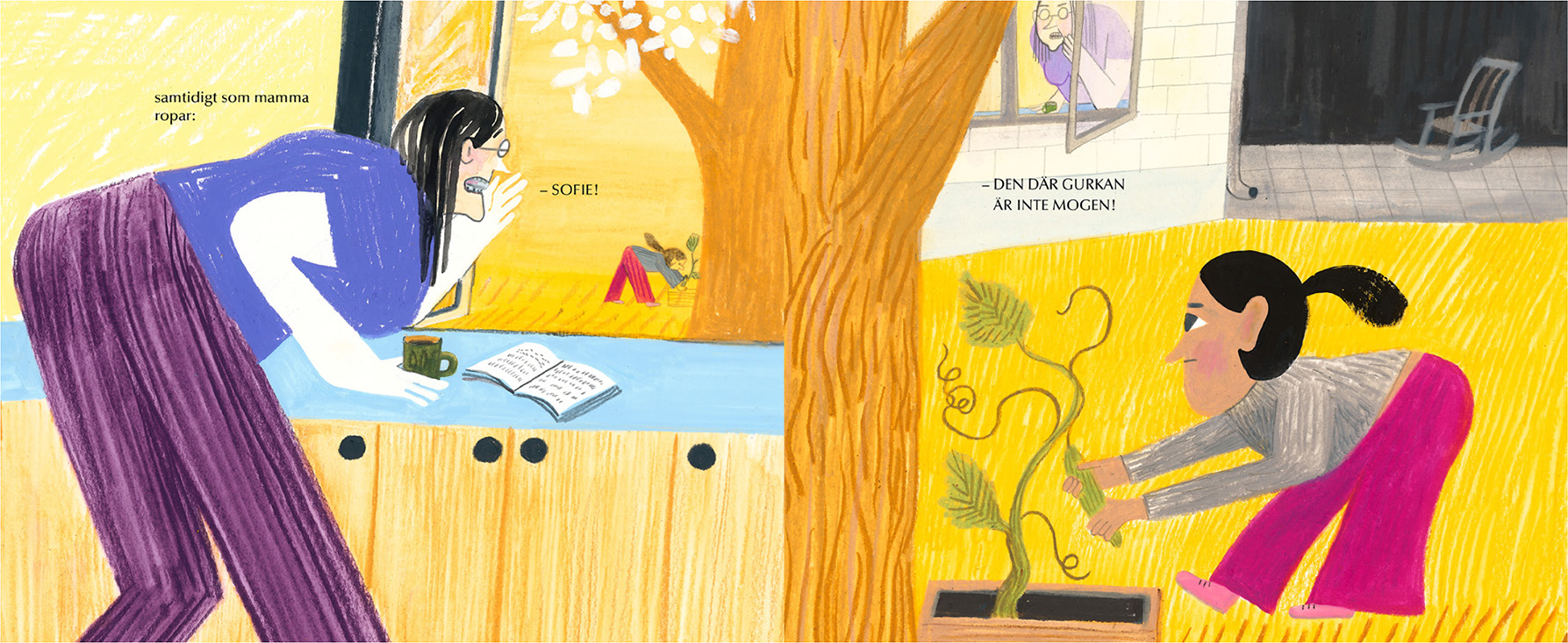 Det sjätte uppslaget domineras av två personer, en mamma och en dotter (”Sofie”). Textraden lyder på vänstersidan ”samtidigt som mamma ropar: – SOFIE!” och på högersidan ” – DEN DÄR GURKAN ÄR INTE MOGEN!” (Adbåge). Spänning skapas genom att läsaren undrar om Sofie kommer att rycka åt sig gurkan eller inte – med båda händerna håller hon hårt i en gurka som sitter fast i en planta (bild 2). Ett rim kan också, vid högläsning, skapa intresse genom att ”skogen” på det förra bilduppslaget här rimmar på ”mogen”. För övrigt är uppslaget intressant eftersom det visar exempel både på hur något är (as is) och skulle kunna vara (as if): det finns en gurka som Sofie skulle kunna plocka men det är inte säkert att hon gör detta. Den uppfattning som mamman ger uttryck för, att gurkan skulle behöva mogna, gör att tid här – till skillnad från tidigare i boken – förbinds med föreställningar om tid som något som är relativt med tanke på tidsrymders avgränsning (här: mognad).