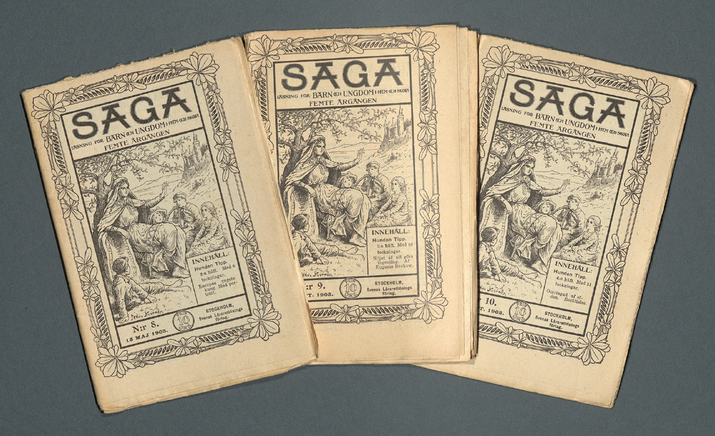När Svensk läraretidnings förlagsaktiebolag bildades 1896 var det för att skapa en stabilare grund åt den redan befintliga utgivningen av tidningarna Svensk läraretidning, Jultomten och Tummeliten (Berg). Bokserien Barnbiblioteket Saga, som lanserades 1899, skulle snart bli deras flaggskepp. Böckerna i bokserien fick stor spridning eftersom de först trycktes i billiga tidningsliknande häften som det var möjligt att prenumerera på (bild 1). Folkskollärarna uppmanades att distribuera subskriptionshäftena till folkskolebarnen och på så sätt skulle fler samhällsskikt nås av den kvalitativa litteraturen (Klingberg 36–50; Landahl 185–220).