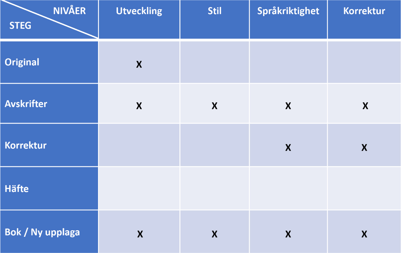 Tabell 1. Steg och nivåer i redaktionens arbete från författaroriginal till bok och nya upplagor. Kryssen i tabellen visar tentativt var i materialet de olika nivåerna syns.