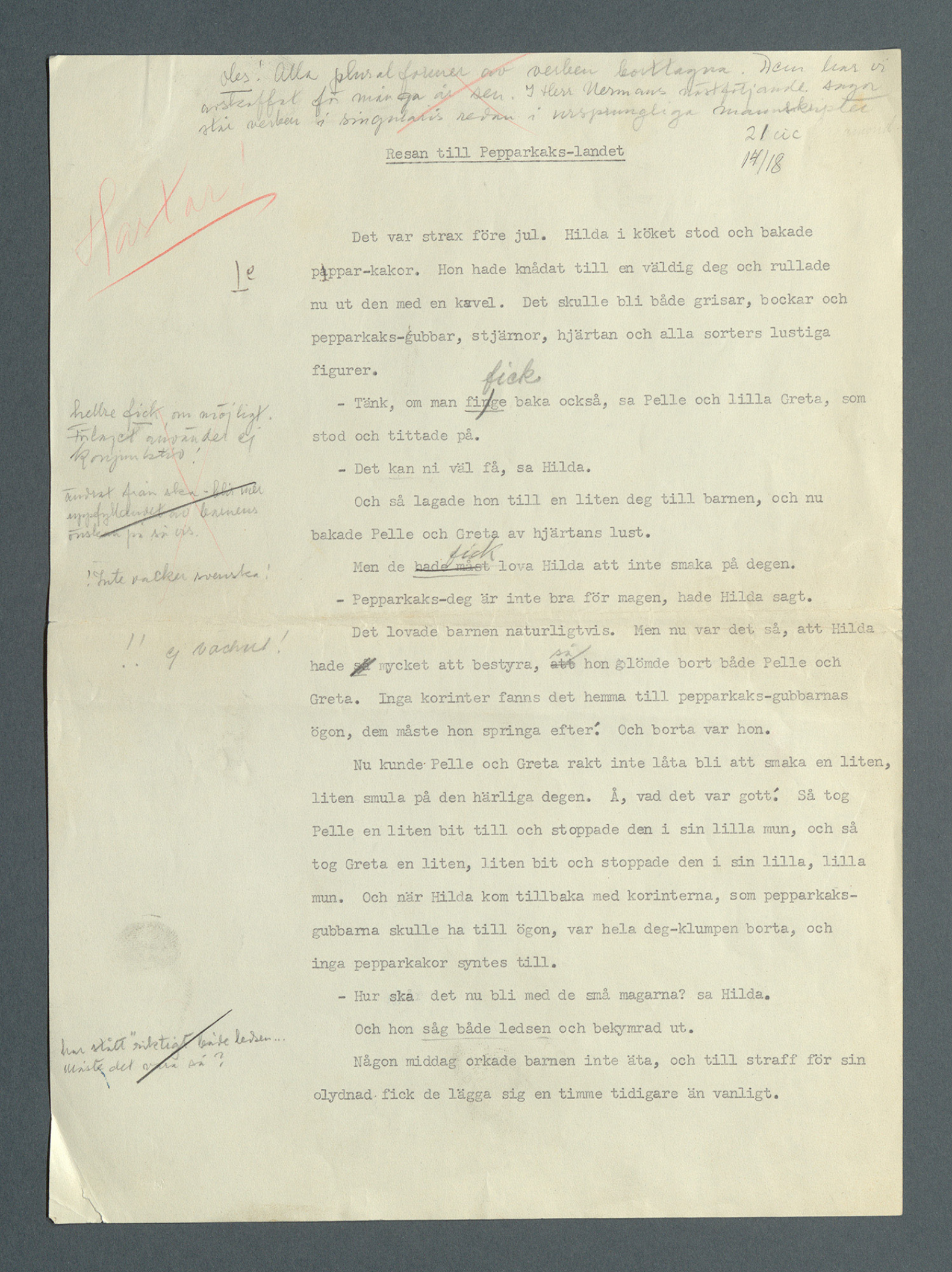 ---. Manuskript till ”Resan till Pepparkaks-landet” [publicerades i bilderboken Mina bästa sagor 1953]. Sagaarkivet, Svenska barnboksinstitutet, Stockholm, avdelning I: F VII:1.