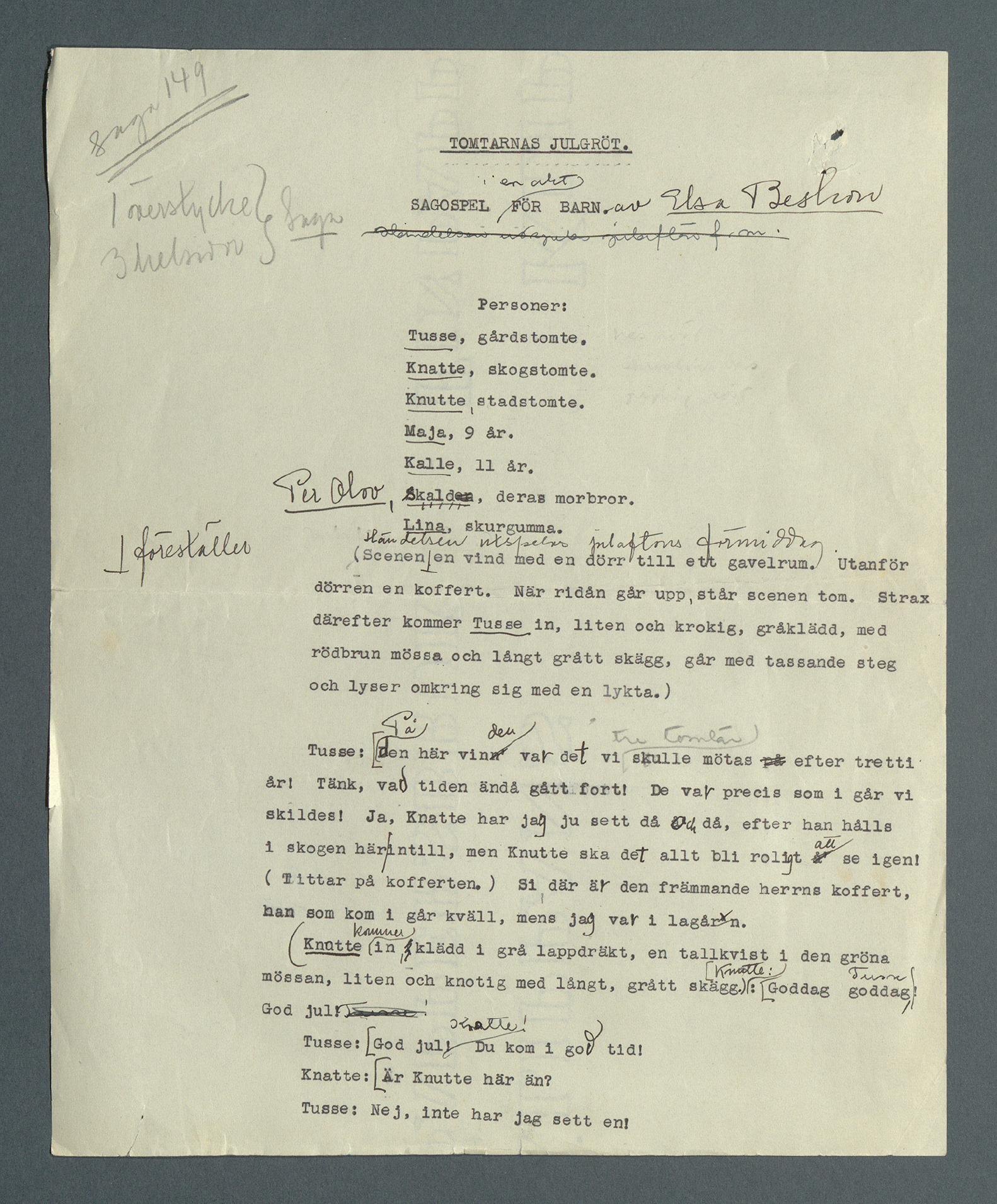Beskow, Elsa. Manuskript till ”Tomtarnas Julgröt” [publicerades i samlingen Barnteatern 1932]. Sagaarkivet, Svenska barnboksinstitutet, Stockholm, avdelning I: F II:62.