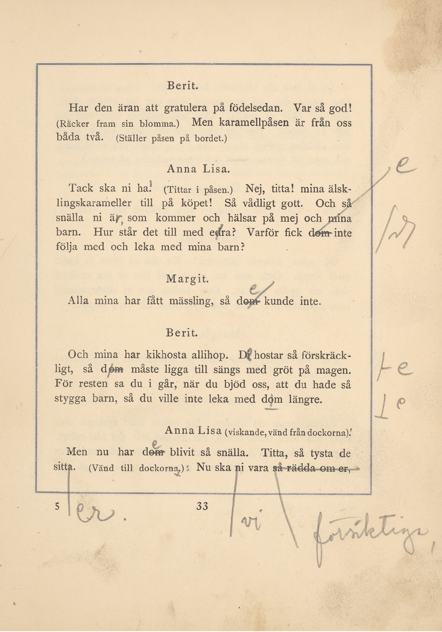 Ytterligare en aspekt av det redaktionella arbetet med utvalda texter aktualiseras i arbetet med boken Barnteatern. Vid insamlingen av pjäser som ska ingå i volymen lokaliseras tryckta texter i tidningar och böcker som bearbetas direkt i sina ursprungliga publikations-sammanhang. Exempelvis finns ett arkivexemplar av Julia Svedelius Små sagospel för barn och ungdom (1912) med revideringskommentarer på språkriktighetsnivån införda direkt på boksidan (bild 4). Dessa ändringar är intressanta att följa eftersom de speglar redaktionens praktik i avskriftssteget: ett tidigare tryckt dokument får i processen status som avskrift nummer ett (vanligtvis förefaller redaktörerna inte göra ändringar direkt i författaroriginal). I detta från ”bok” till ”avskrift” transformerade förlagsdokument kan man se att ”dom” i replikerna byts ut till ”de” respektive ”dem” och pluraländelserna ersätts med enhetsformer i singular. Samma tillvägagångssätt har redaktionen när det kommer till Saida Norgrens bidrag ”En julkväll i skogen” från barntidningen Daggdroppen (1929). Även här är de redaktionella revideringarna av replikerna införda med blyerts direkt i den tidigare tryckta publikationen och återspeglar redaktionens principer för språkriktighet i steg två: ”se’n” ersätts med ”sedan”, ”passa” med ”passar” och ”dom” ersätts genomgående med ”de” och ”dem”.