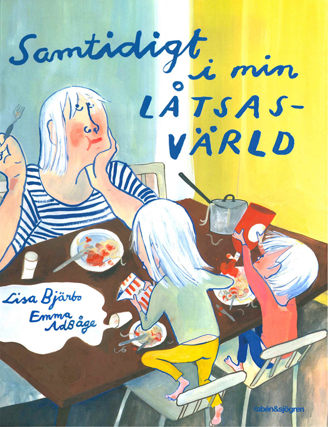 Image 1. Cover. From Samtidigt i min låtsasvärld (2018) by Lisa Bjärbo and Emma AdBåge. © Lisa Bjärbo and Emma AdBåge.