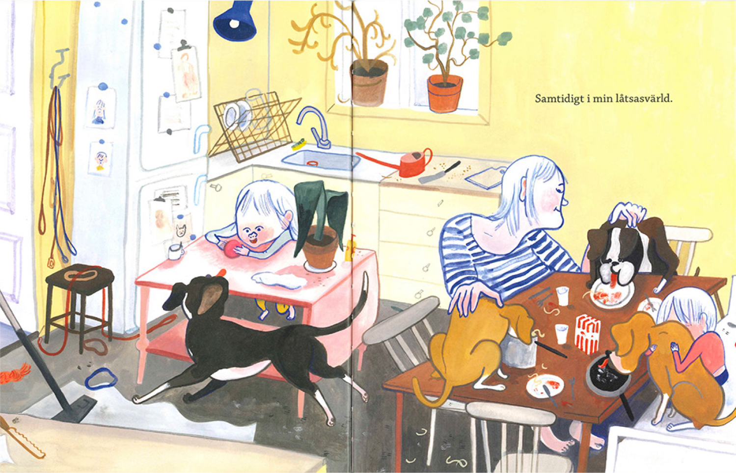 Even though I consider Samtidigt i min låtsasvärld to have the affordances to act as an alter-tale, a similar ambivalence can be found in this picturebook. On the one hand, one could say that Samtidigt i min låtsasvärld adheres to “good” motherhood, or “intensive mothering” by allowing children to be constantly part of the mother’s imagined world. Indeed, the picturebook does not show what happens to the adult character when she is not mothering, but narrates what happens “samtidigt”, at the same time. On the other hand, by showing that the mother often dreams of other things while doing these mothering tasks, the book invites children to orient theory of mind towards their parents and mothers in particular. Moreover, by focusing on seemingly childlike pleasures, such as eating a huge ice cream or cake covered with sweets, going to the swimming pool or having dogs around to “do the dishes”, the book disrupts the idea of adulthood as consisting of “serious things”, and creates kinship across generations.