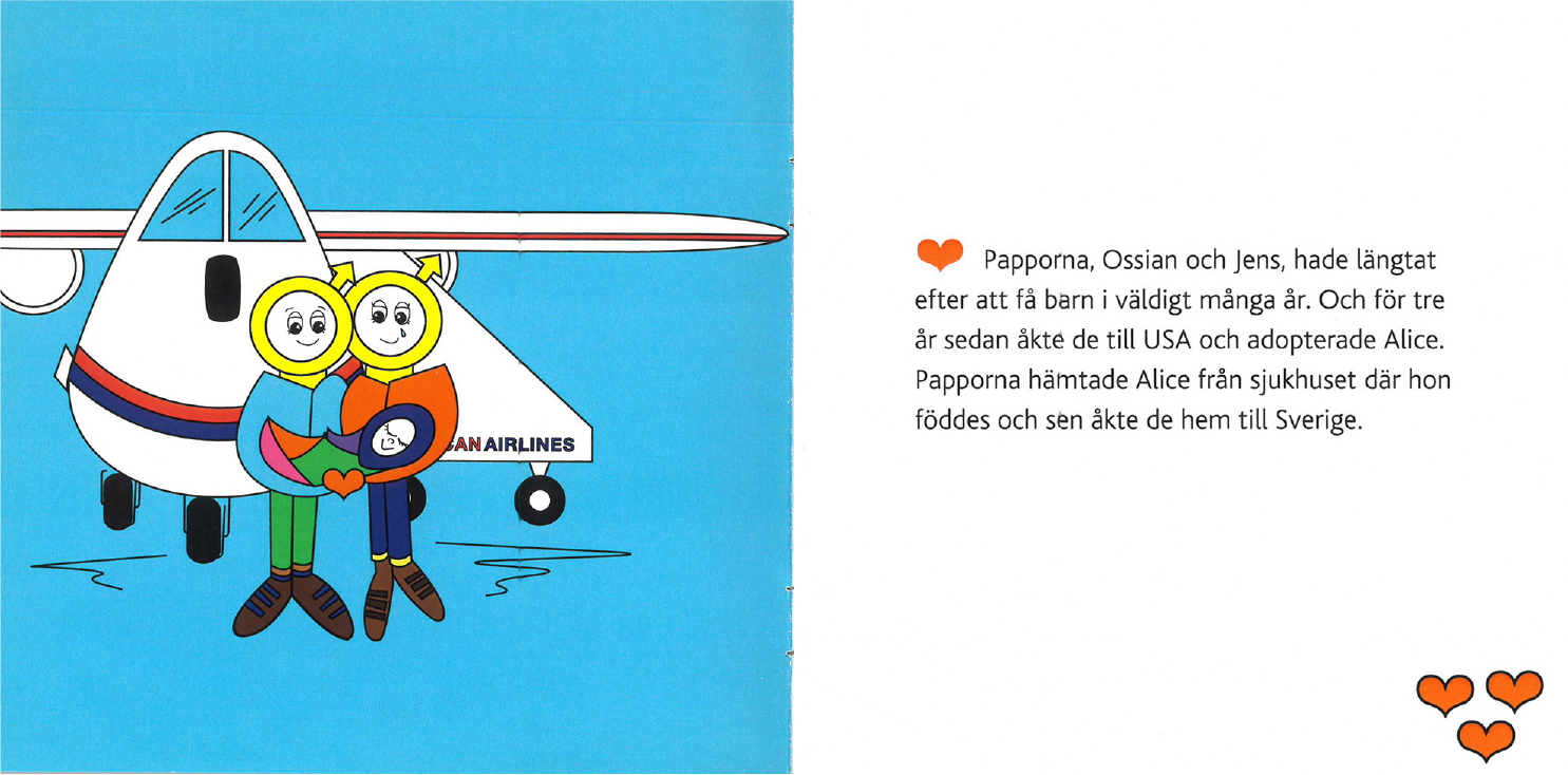 I den mån det är möjligt att dra slutsatser utifrån ett så litet material går det att ana en utveckling mot växande frispråkighet kring surrogatmödraskap som sker i takt med tilltagande utbredning och normalisering av praktiken i Sverige. Det är dock endast den översatta Vems mage bodde JAG i? (2020), av Manuela O’Reilly, som explicit marknadsförs som en berättelse om surrogatmödraskap. Övriga titlar befinner sig snarare i ett gränsland mellan adoption och surrogatarrangemang där de öppnar för en surrogatläsning. Med sitt ofta starka fokus på normkritik kan de även läsas som berättelser om alternativ familjebildning i mer generell bemärkelse. Vagheten kan förstås utifrån viljan att berätta om en existerande erfarenhet, men på ett sätt som fungerar inom 2010-talets svenska diskurs. Det innebär att den möjliga surrogattolkningen blir ett dolt budskap, riktat mot den som kan avkoda markörerna. I Alice och papporna åker till USA (2011), av Karolina Schubert, Anneli Nygårds och Johanna Hermann Lundberg, framgår det till exempel att papporna hämtar Alice på ett sjukhus i Kalifornien – ett epicentrum för amerikansk surrogat-verksamhet på grund av delstatens liberala lagstiftning. Samtidigt refererar texten inte till ett surrogatmödraskap, utan till en adoptionsprocess (se bild 1). Den införstådde vet dock att adoption av barn som fötts av en surrogatmoder ingår i det internationella surrogatarrangemanget, liksom att internationella adoptioner där föräldrarna utgörs av ett samkönat, manligt par är mycket ovanliga – de första i Sverige genomfördes så sent som 2017. En liknande tvetydighet finns i Hedvig van Berlekoms och Adrian van Berlekoms Pappornas bebisresa (2020) som, trots att den behandlar ett partiellt altruistiskt surrogatmödraskap, är så pass obestämd kring omständigheterna att upplägget skulle kunna passera som en fyrklöverkonstellation mellan två par (se bild 2).