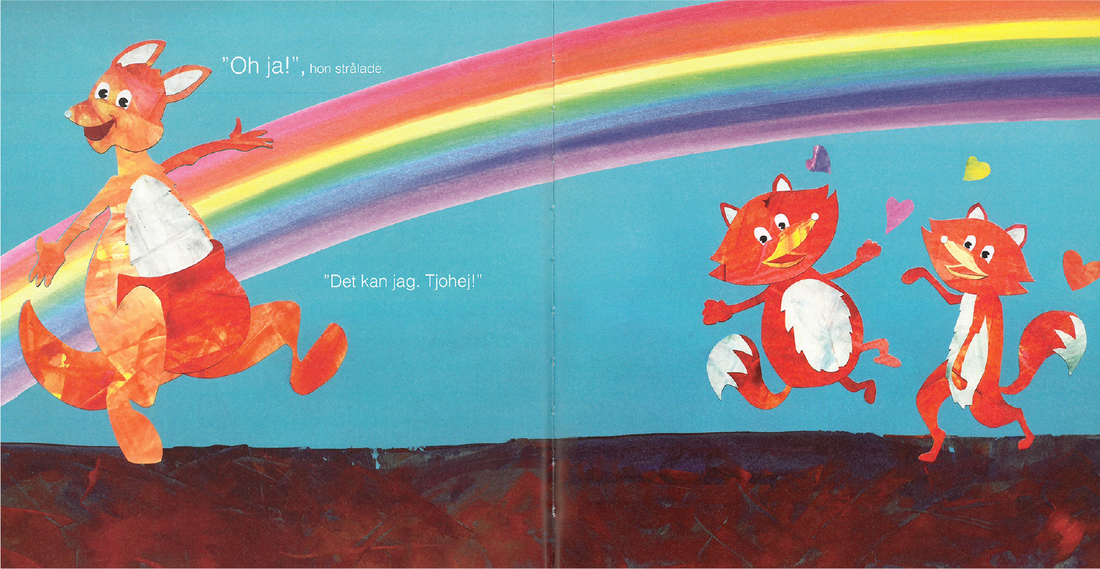 Bild 3. Fru Känguru hjälper gärna rävarna att få egna barn. Ur Vems mage bodde JAG i? (2020) av Manuela O’Reilly. © Manuela O’Reilly.
