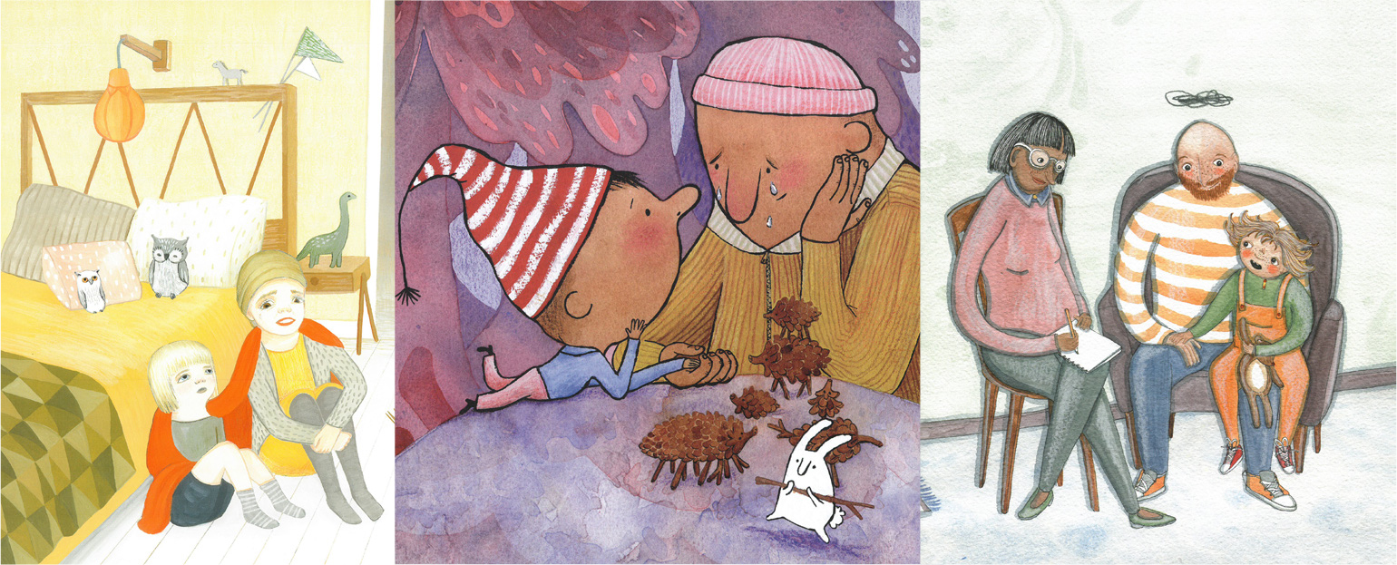 Bild 4, 5 och 6. Barnet och en vuxen samtalar om sjukdomen. Ur Mammas Liv (2014) av Mi Tyler och Malin Ahlin (beskuren), Pappan som tappade bort glädjen (2021) av Camilla Gunnarsson och Maya Jönsson (beskuren) och Ett hav i vardagsrummet (2020) av Gabriel Häggebrink och Signe Gabriel (beskuren). © Malin Ahlin, Maya Jönsson och Signe Gabriel.