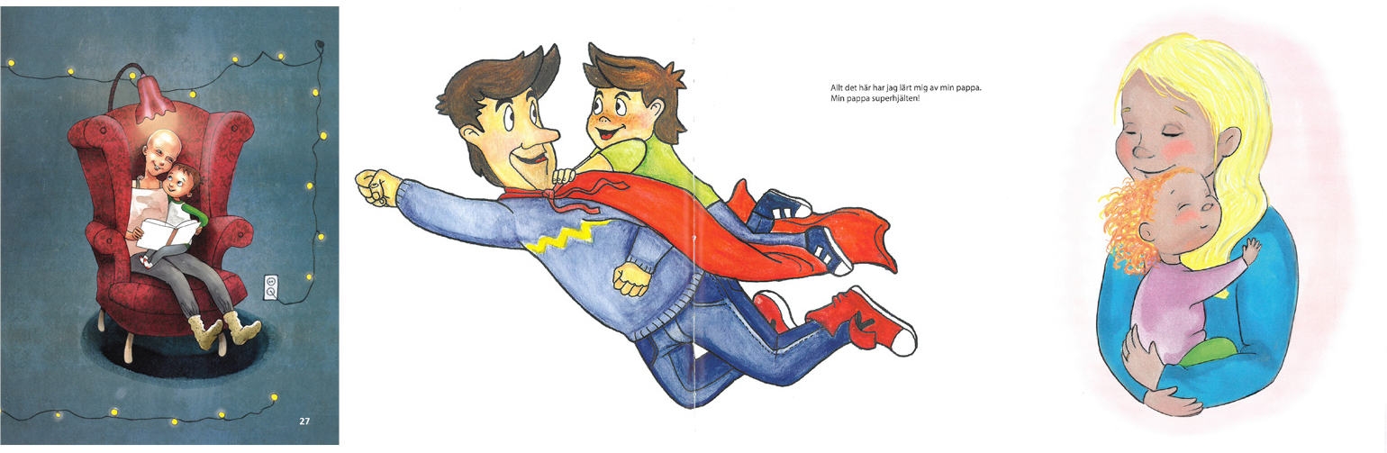 Bild 7, 8 och 9. Goda stunder mellan barn och sjuk vuxen. Ur Min skalliga mamma (2018) av Camilla Dahlson och Katarina Vintrafors (27, beskuren), Min pappa superhjälten (2020) av Emil Arnell och Johanna Arnell, En dum knöl i mammas bröst (2022) av Annie Hagvall Einarsrud och Hanna Ingvarsson. © Katarina Vintrafors, Johanna Arnell och Hanna Ingvarsson.