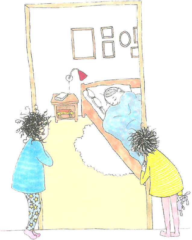 I andra berättelser gestaltas föräldrarnas plötsliga otillgänglighet som skrämmande – som irritation och ilska som barnet inte kan tolka (Hedberg och Forssell; Björkman och Håkansson), eller som ett irrationellt beteende vilket lämnar barnet i en utsatt situation (Persson och Holmberg; Persson). Återkommande i materialet är bilden av den utslagna mamman på soffan eller i sängen, sovandes eller med bortvänd blick (se bild 10).